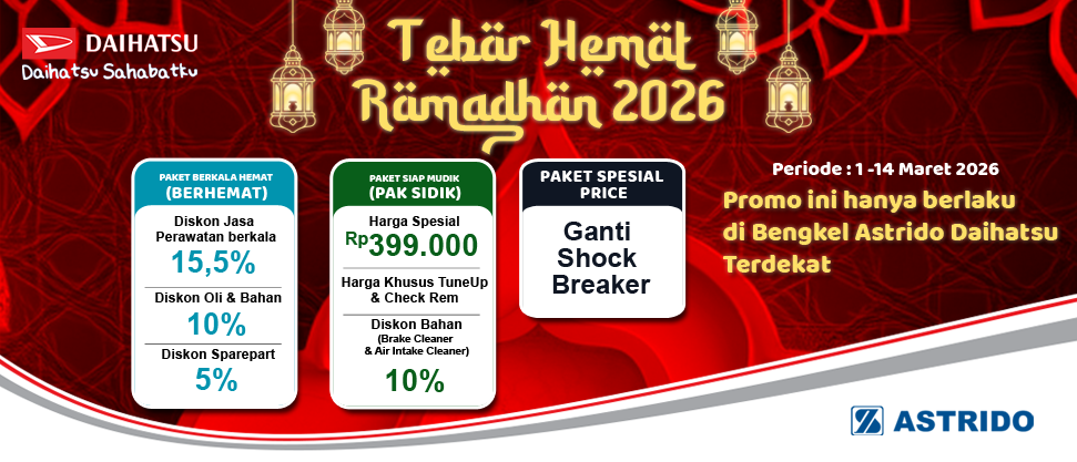Selain dari promo pembelian mobil Daihatsu, ASTRIDO Daihatsu kerap kali juga memberikan promo dan potongan harga untuk layanan servis. Promo servis mobil Daihatsu ini dapat berupa diskon harga jasa, sampai diskon harga sparepart asli Daihatsu / Daihatsu Genuine Parts. Tentunya jika Anda mendapatkan promo ini, servis rutin mobil Anda dapat menjadi semakin hemat. Promo servis mobil Daihatsu berlaku di seluruh 8 cabang bengkel resmi ASTRIDO Daihatsu sesuai dengan syarat dan ketentuan yang berlaku.